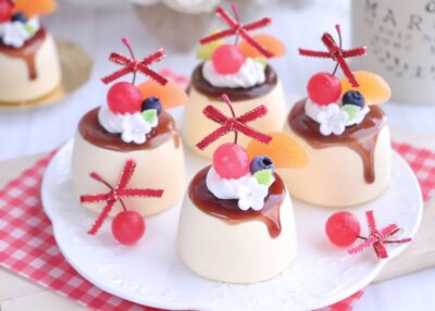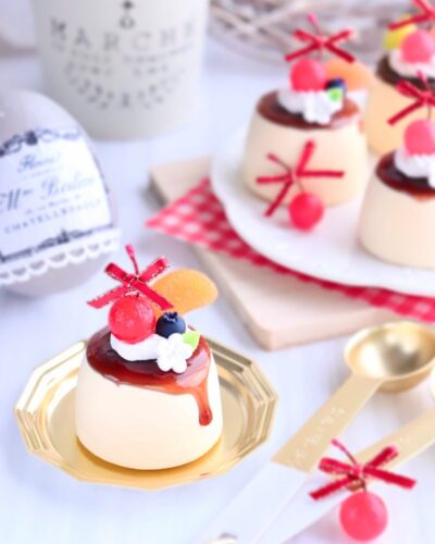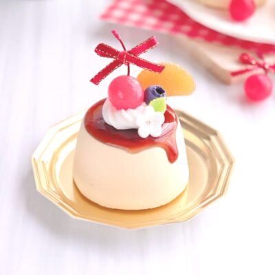 可愛いフルーツが乗ったつやつやカラメルのプリンを